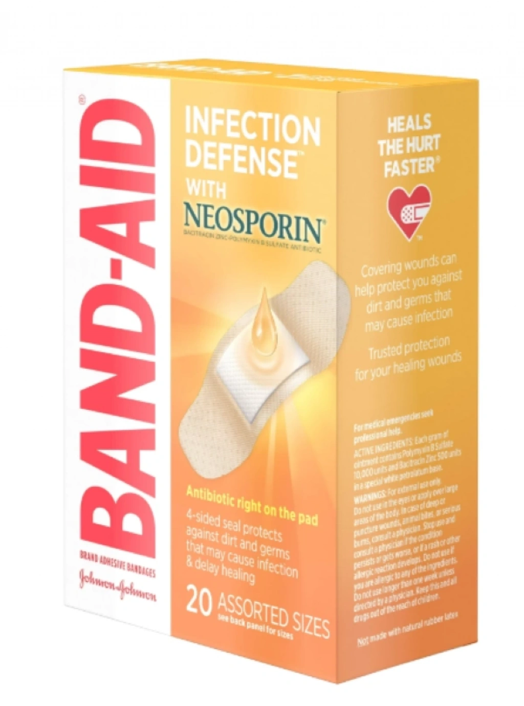 Neosporin içeren bu Band-Aid Marka Yapışkanlı Bandaj Enfeksiyon Savunma paketinde çeşitli boyutlarda 20 steril bandaj bulunmaktadır