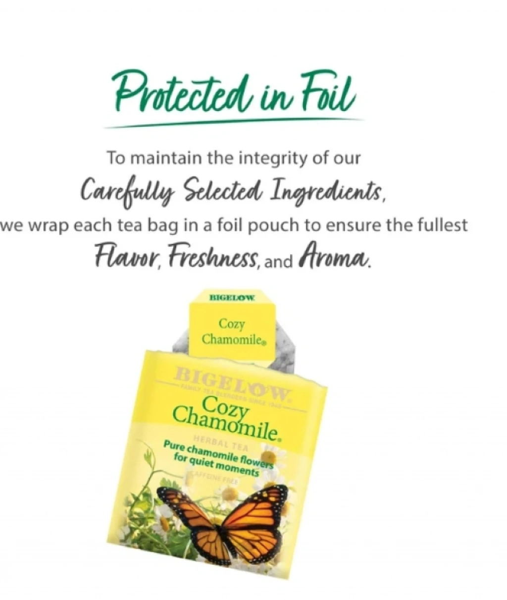 Bigelow Papatyası'ndan daha iyi bir rahatlama yolu yoktur. Papatya hem sakinleştirici hem de rahatlatıcı özelliğiyle size iyi gelir. Bigelow Bitki Çayı'nı bu kadar özel yapan nedir? İçeriklerimiz, size ödünsüz bir kaliteli çay deneyimi sunmak için Bigelow ailesi tarafından özenle seçilir. Narin, tatlı ve zengin aromalı bir çay yaratmak için bütün papatya çiçekleri kullanırız. Bu kafeinsiz bitki çayının her kutusu 20 çay poşeti içerir. Olağanüstü içeriklerimizin bütünlüğünü korumak için, her çay poşetini maksimum lezzet, tazelik ve aroma sağlamak üzere bir folyo poşete sarıyoruz. Ayrıca, Bigelow Çayı'nı gittiğiniz her yere götürmenizi de kolaylaştırır. Bigelow Çayı, 75 yılı aşkın süredir %100 aile şirketi olarak işletilmekten gurur duymaktadır. Sertifikalı B Şirketi olmaktan onur duyuyoruz. Bu başarı, en yüksek sosyal ve çevresel etki standartlarına olan bağlılığımızı takdir etmektedir. Çünkü doğru olanı yapmakla ilgilidir.