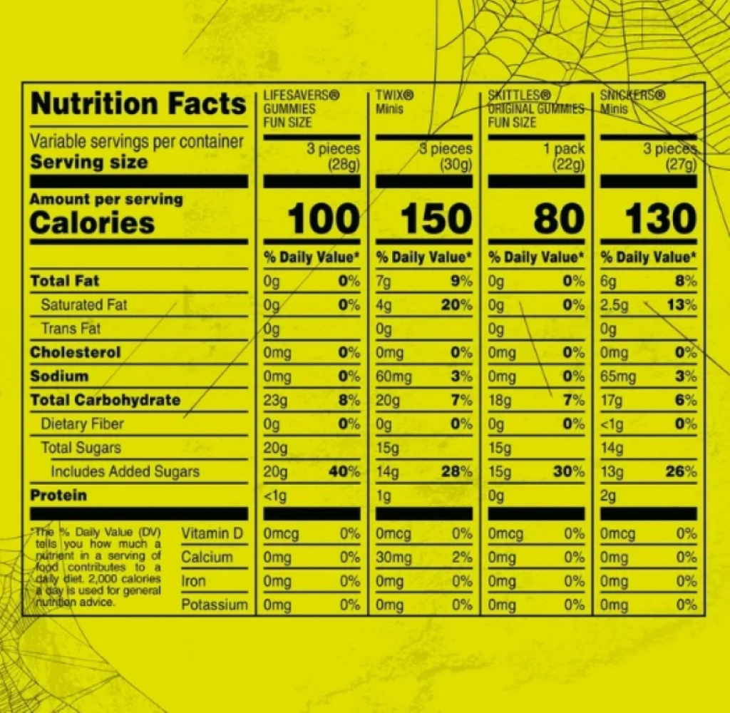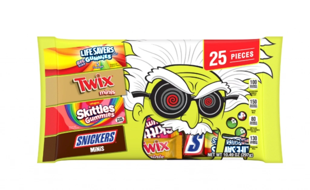 Bir (1) adet 10,49 oz'luk toplu şeker poşeti, her birinden 25 adet Fun Size ve Mini SNICKERS Sütlü Çikolata, SKITTLES Orijinal Sakızlı Şekerler, TWIX Karamelli Kurabiyeler ve LIFE SAVERS Büyük Halka Şeker Cadılar Bayramı Sakızları içerir.