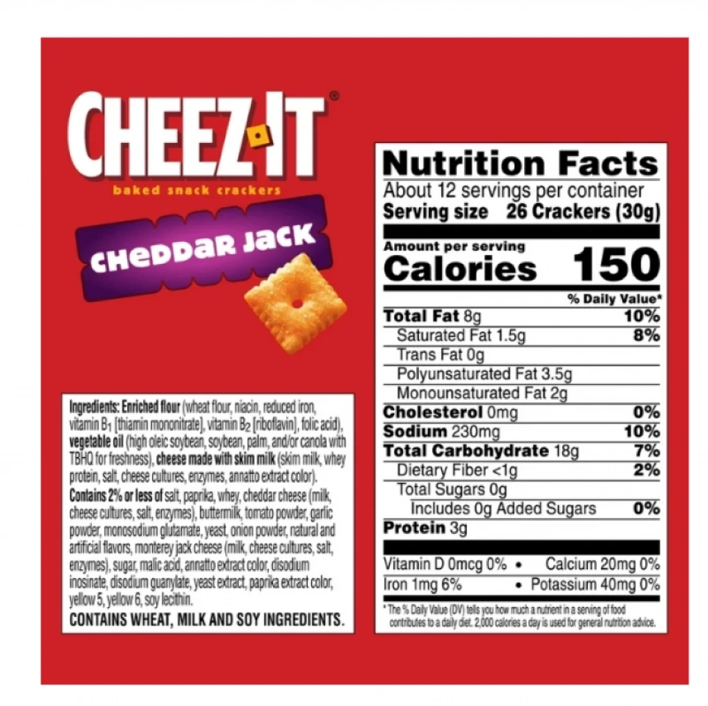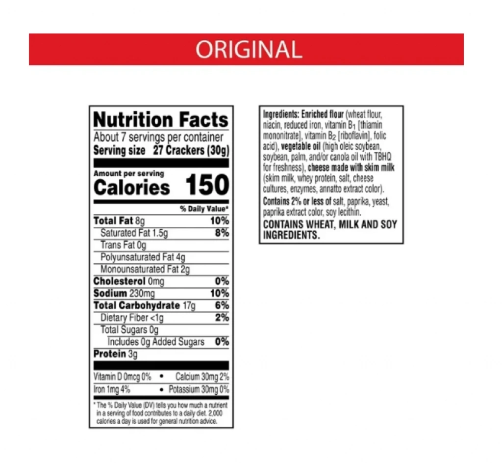 Zenginleştirilmiş un (buğday unu, niasin, indirgenmiş demir, B1 vitamini [tiamin mononitrat], B2 vitamini [riboflavin], folik asit),bitkisel yağ (tazelik için TBHQ ile yüksek oleik soya fasulyesi, soya fasulyesi, palm ve/veya kanola),yağsız sütle yapılan peynir (yağsız süt, peynir altı suyu proteini, tuz, peynir kültürleri, enzimler, annatto özütü rengi). %2 veya daha az tuz, kırmızı biber, peynir altı suyu, çedar peyniri (süt, peynir kültürleri, tuz, enzimler),ayran, domates tozu, sarımsak tozu, monosodyum glutamat, maya, soğan tozu, doğal ve yapay aromalar, monterey jack peyniri (süt, peynir kültürleri, tuz, enzimler),şeker, malik asit, annatto özütü rengi, disodyum inosinat, disodyum guanilat, maya özütü, kırmızı biber özütü rengi, sarı 5, sarı 6, ben lesitinim.