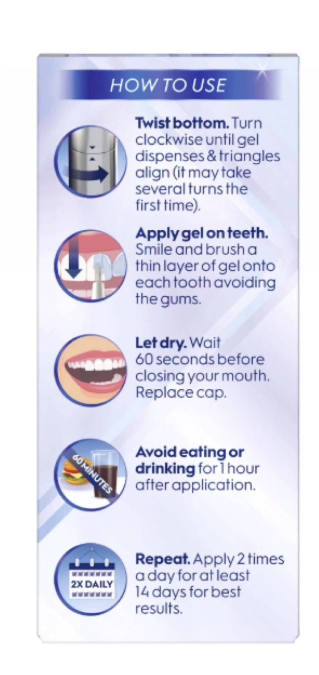 Dişlerinizi beyazlatmaya zamanınız yok mu? Crest 3DWhite Diş Beyazlatma Kalemi'ni deneyin! Hassas aplikatörü sayesinde kullanımı kolay ve kompakt yapısıyla hareket halindeyken bile beyazlatma için idealdir. Crest 3DWhite Beyazlatma Kalemi, günlük kullanım için mineye zarar vermez; en iyi sonuçlar için 14 gün boyunca günde 2 kez uygulayın. Crest Beyazlatma Kalemi, yüzey lekelerini gidermeye yardımcı olur ve diş hekimlerinin kullandığı aynı beyazlatıcı bileşeni içerir. Günlük, hareket halindeyken beyazlatma için çantanızda, banyoda veya seyahat çantanızda bir tane bulundurun!