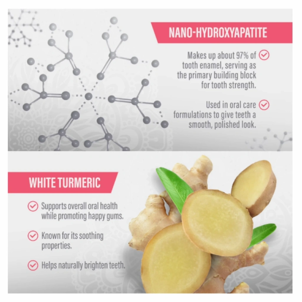 GÜÇLÜ İÇERİKLER: Diş minesinin yüzey bütünlüğünü desteklemeye yardımcı olan, diş minesinde doğal olarak bulunan bir mineral olan nano-hidroksiapatit ile formüle edilmiştir; pürüzsüz ve ferahlatıcı bir temizlik için beyaz zerdeçal, nane ve karanfil ile birleştirilmiştir. Günlük kullanım için tasarlanmış florürsüz hassasiyet giderici bakım.