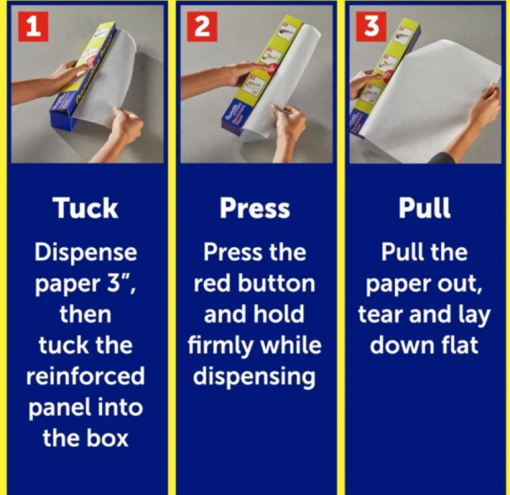 Düz Dağıtım: Kullanışlı Düz Dağıtım ambalajımız, her seferinde parşömen kağıdını düz bir şekilde dağıtmak için güçlendirilmiş bir panele sahiptir.