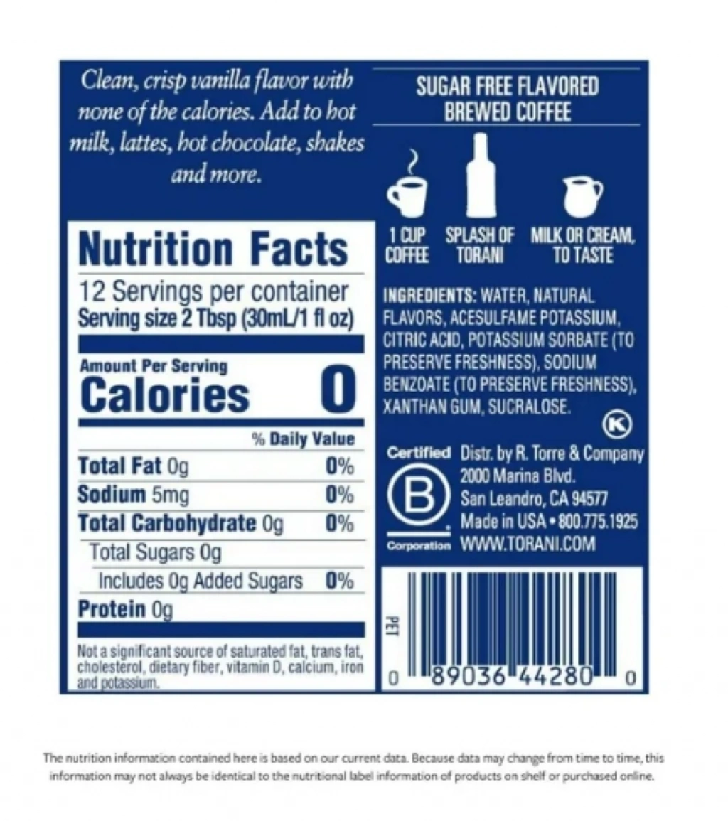 Su, Doğal Aromalar, Asesülfam Potasyum, Sitrik Asit, Potasyum Sorbat (tazeliği korumak için), Sodyum Benzoat (tazeliği korumak için), Ksantan Sakızı, Sükraloz Torani Şekersiz Vanilya Şurubu, Sıfır Kalori, Gerçek Kahve Şurubu, 16,5 oz